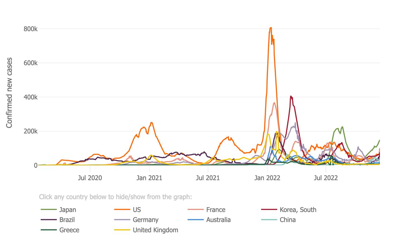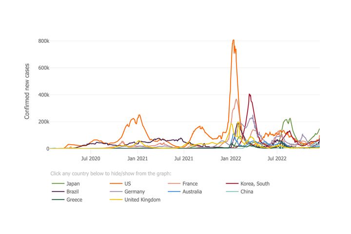 Daily confirmed new COVID-19 cases for the 10 most affected countries over time.